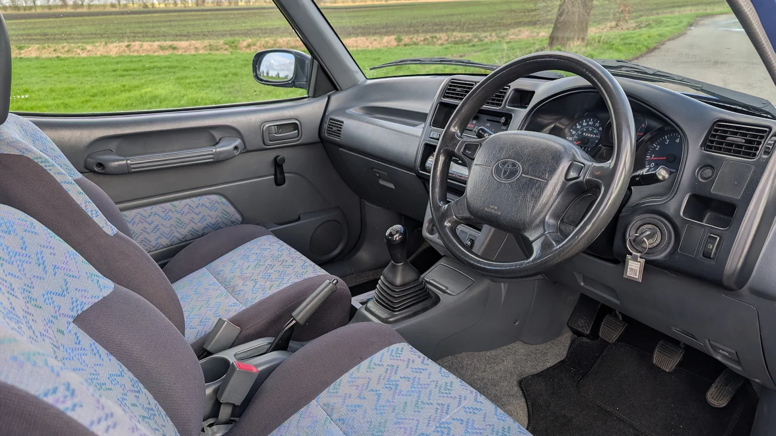 Inside, the RAV4 isn’t quite as cheerful as its exterior. It’s very 1990s – veiny grey plastic and cheap-feeling interior finishes abound, plus you miss out on any steering wheel adjustment so getting comfy isn’t a given. Still, the seat upholstery is suitably period with its jazzy finish, and you get some concessions to modern life – there are even a couple of cupholders.
