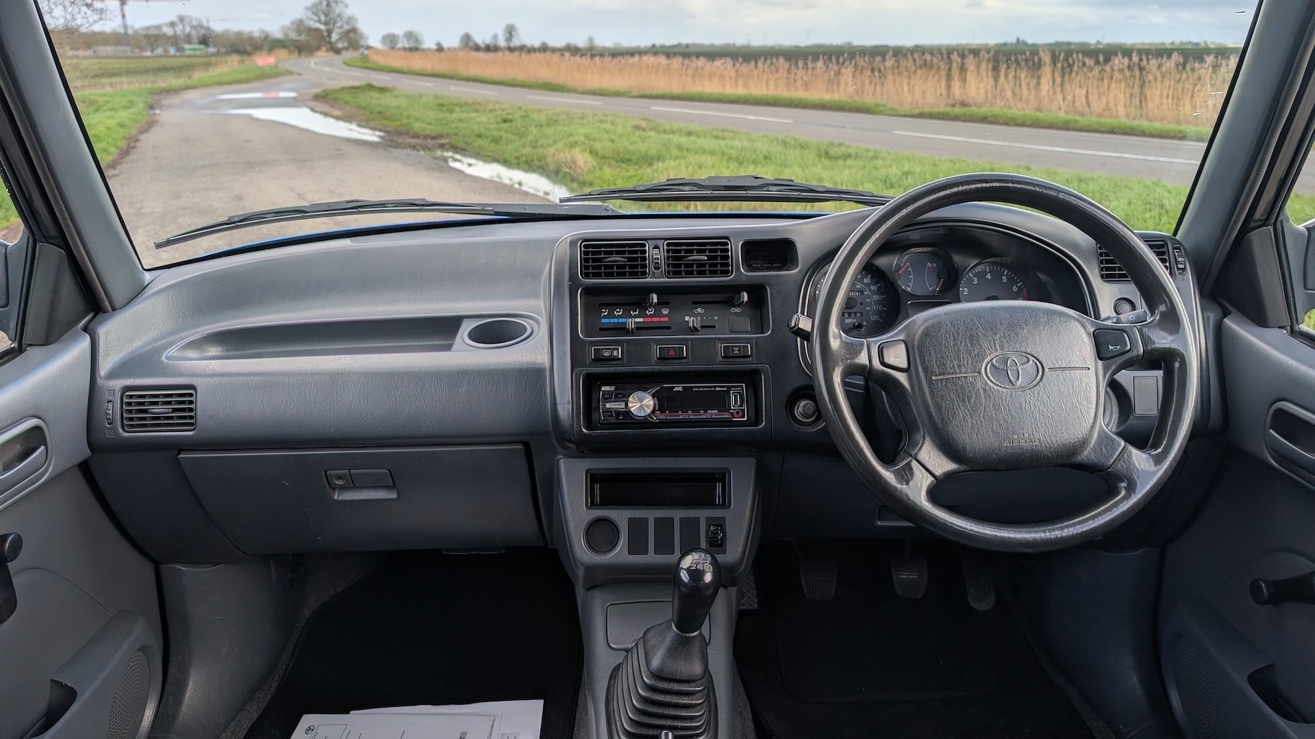 This three-door model from Toyota UK’s heritage fleet is well-used, with over 130,000 miles on the clock, but looks charming in the metal. It has a sturdy stance with a wheel at each corner, and the two-tone roof finish, black plastic cladding, offset rear number plate and spare tyre on the back just suit it down to a T.