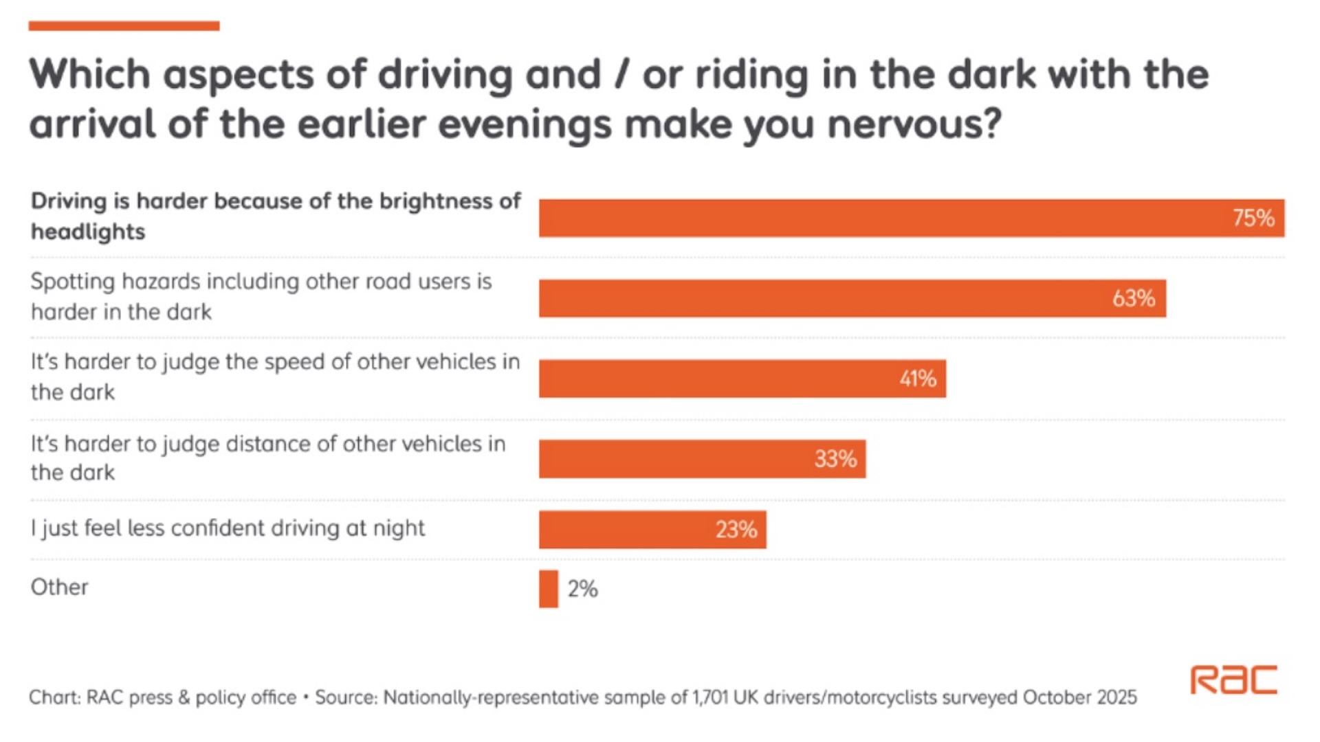 “For many, darker evenings mean coping with overly bright headlights, which can cause discomfort and dazzle,” said RAC senior policy officer, Rod Dennis. “While brighter lights improve visibility, the fact that glare is the top cause of nervousness shows this is an issue that must be addressed.”