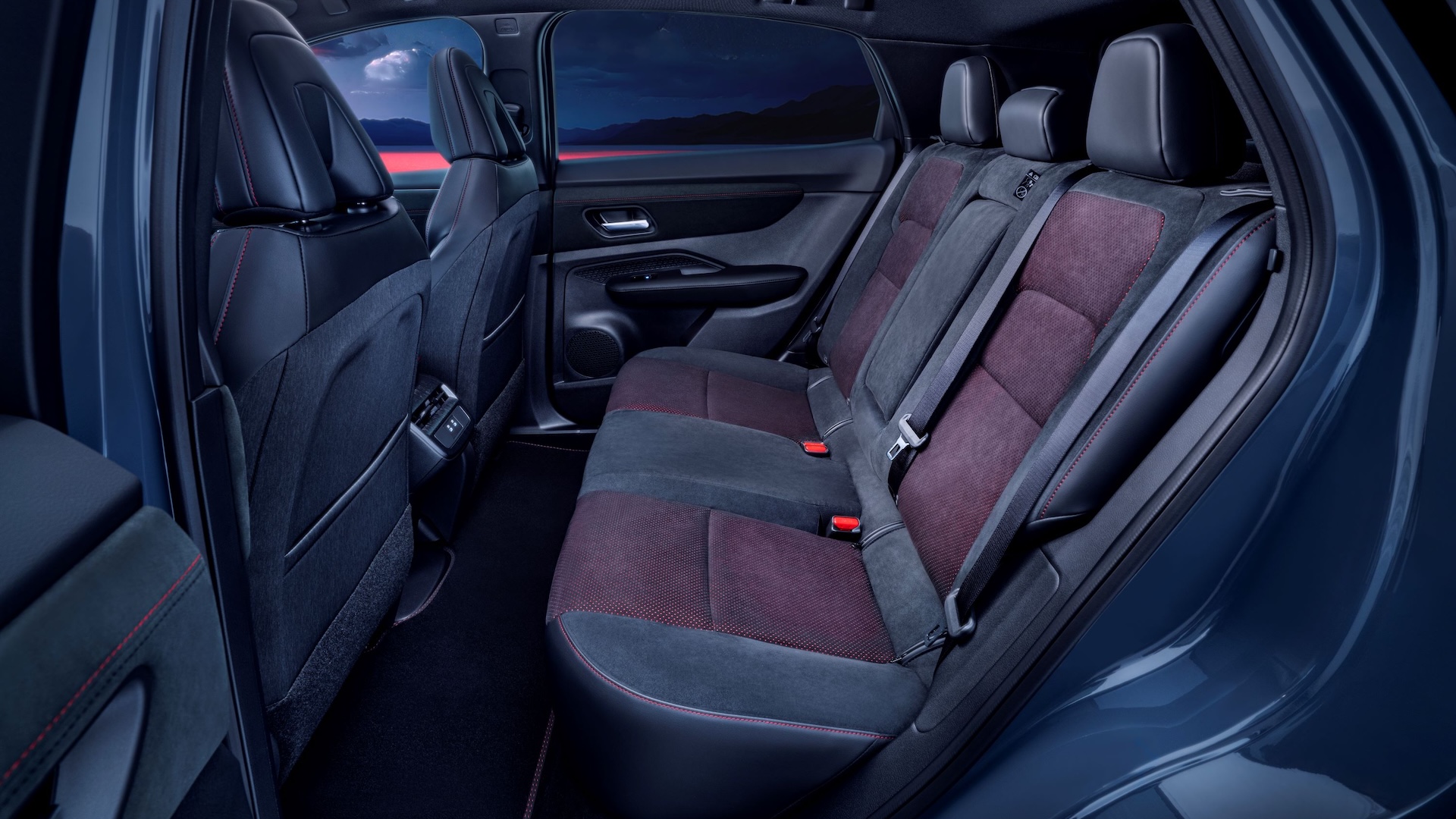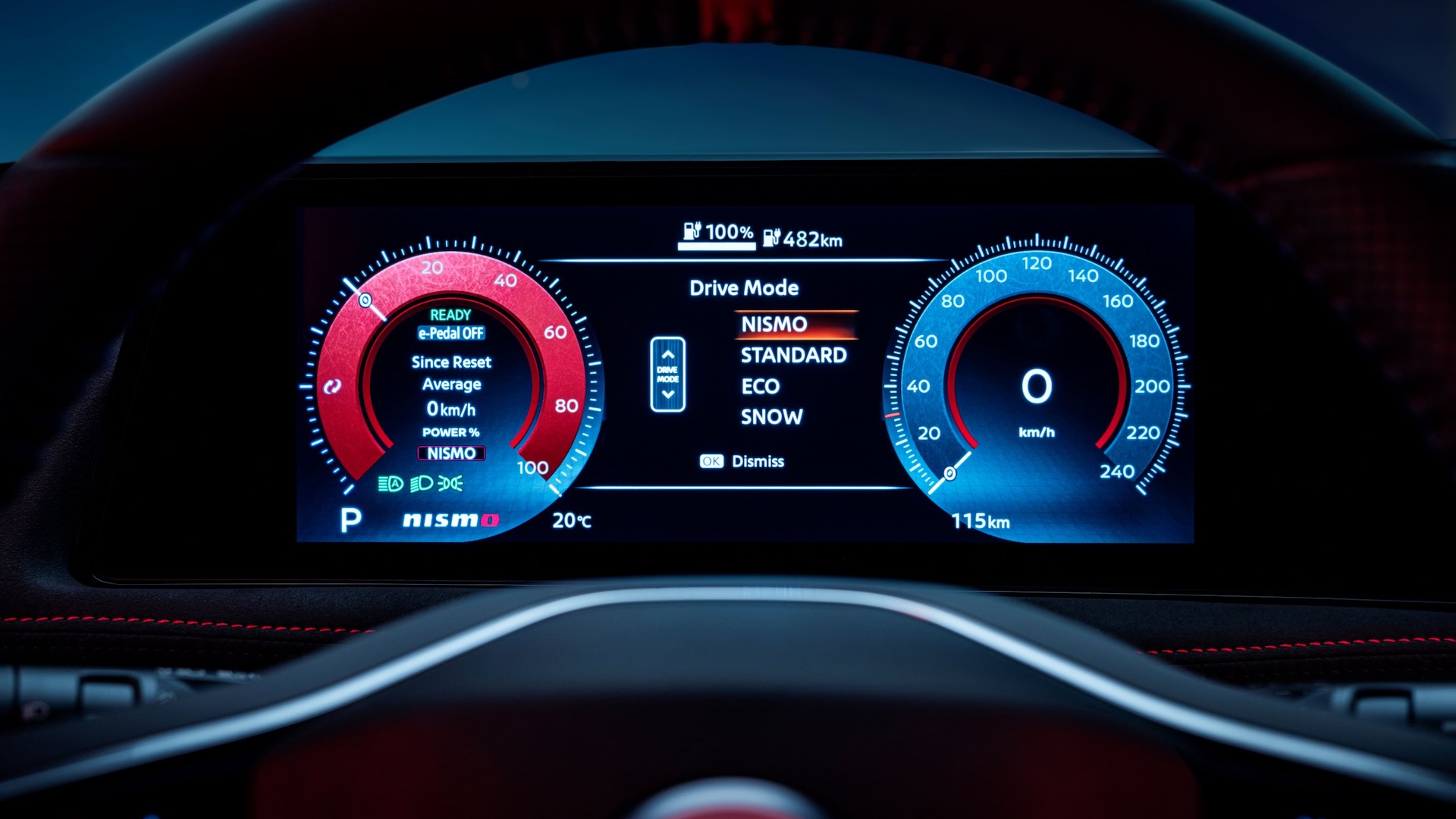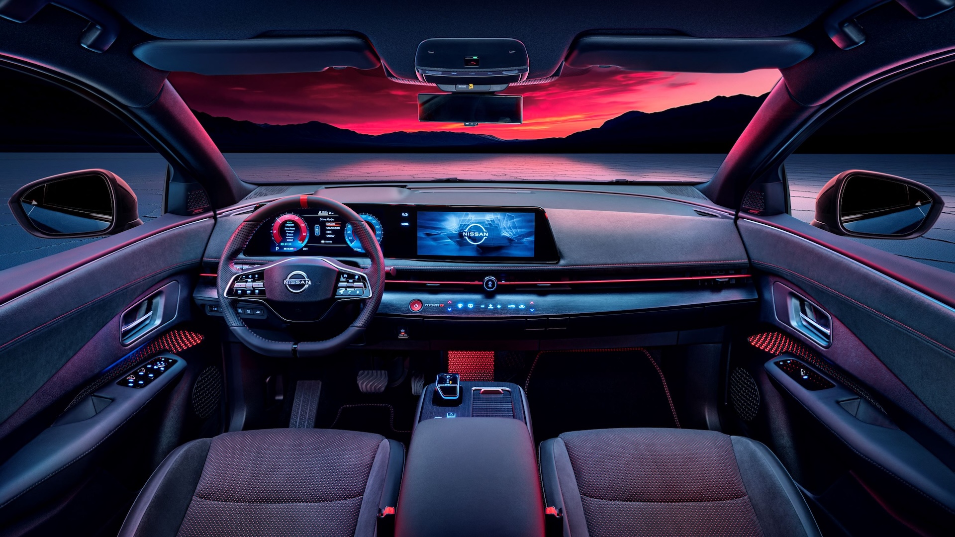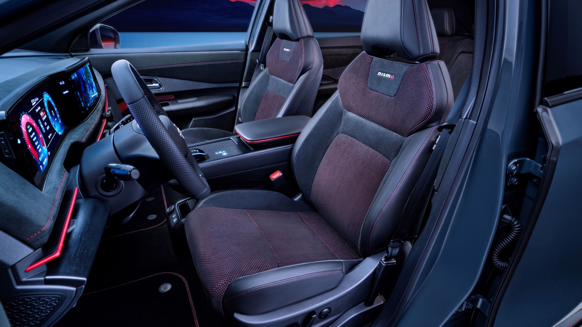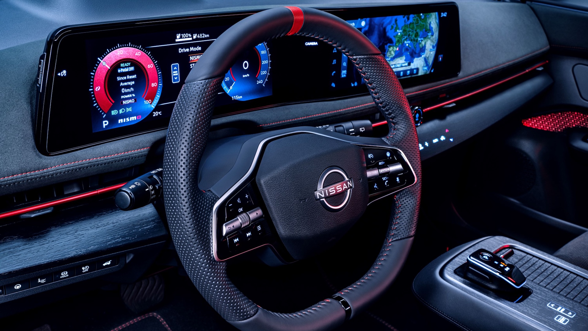 Inside, there are some sporty upgrades for the Nismo model, including a slim red pinstripe detail that runs across the whole width of the dashboard, a red starter button, and a red 12-o’clock marker for the flat-bottom steering wheel — as if anyone is going to be opposite-locking their Ariya Nismo down a rally stage…
