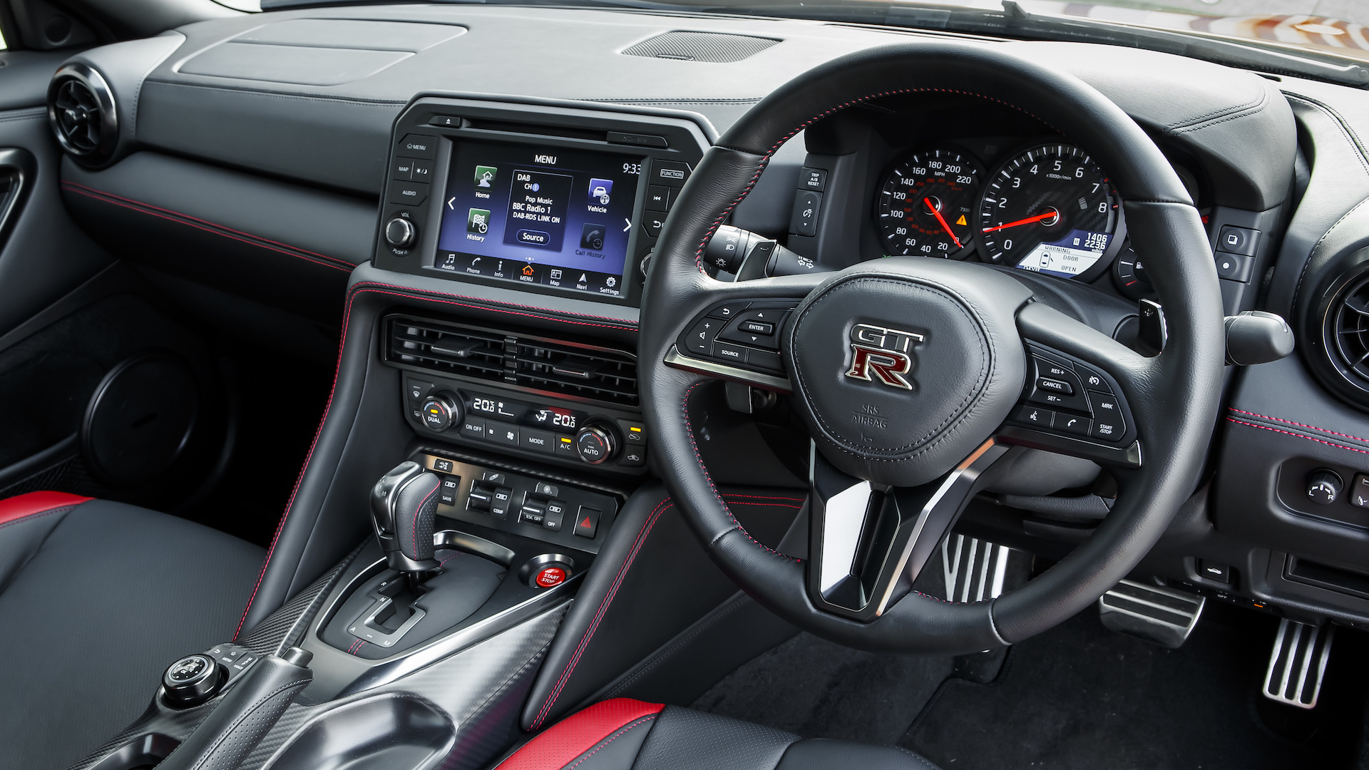 You can also adjust the speed of the automatic gearbox’s gearshifts. The fastest ‘R’ mode wallops you in the back as you shift up the gears with your foot flat on the accelerator. Yet, around town, the gearbox happily shuffles along smoothly, making the GT-R feel no more challenging to drive than a Qashqai.