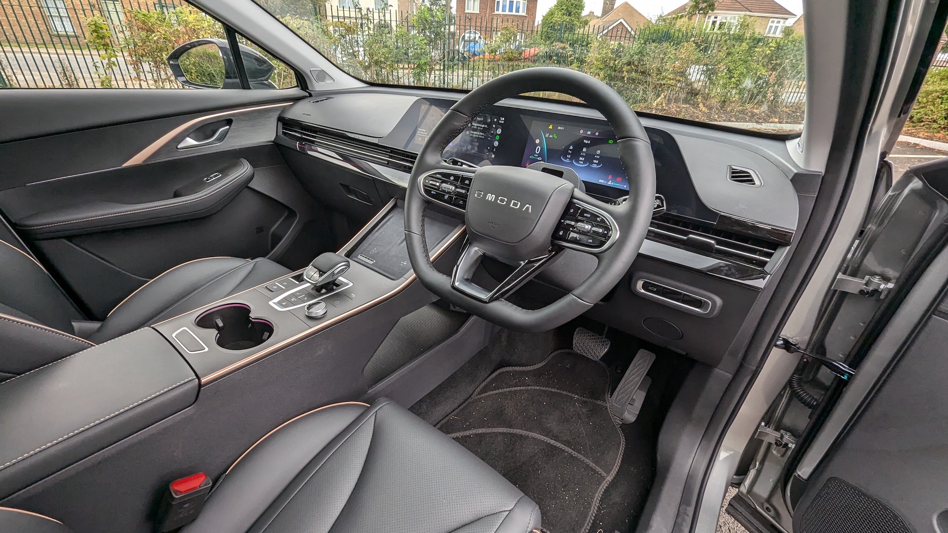 Some of Omoda’s design decisions are more successful than others. We like the minimalist centre console, the strip of climate controls separate from the touchscreen and the straightforward steering wheel and column stalk controls. Less good is the interesting pairing of matte chrome AND rose gold trim - pick one - the busy driver information display, and some of the more oddly-placed controls.