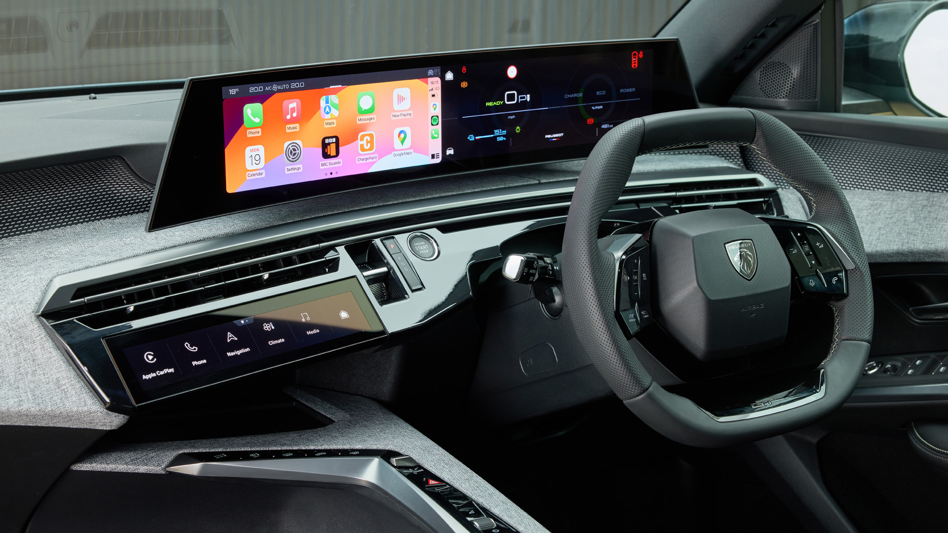 Let’s start with the obvious, the Peugeot E-5008 looks wicked. The sleek “lion’s claw” headlights and sharp creases in the bodywork make it look properly sporty, and the interior is just as stylish.