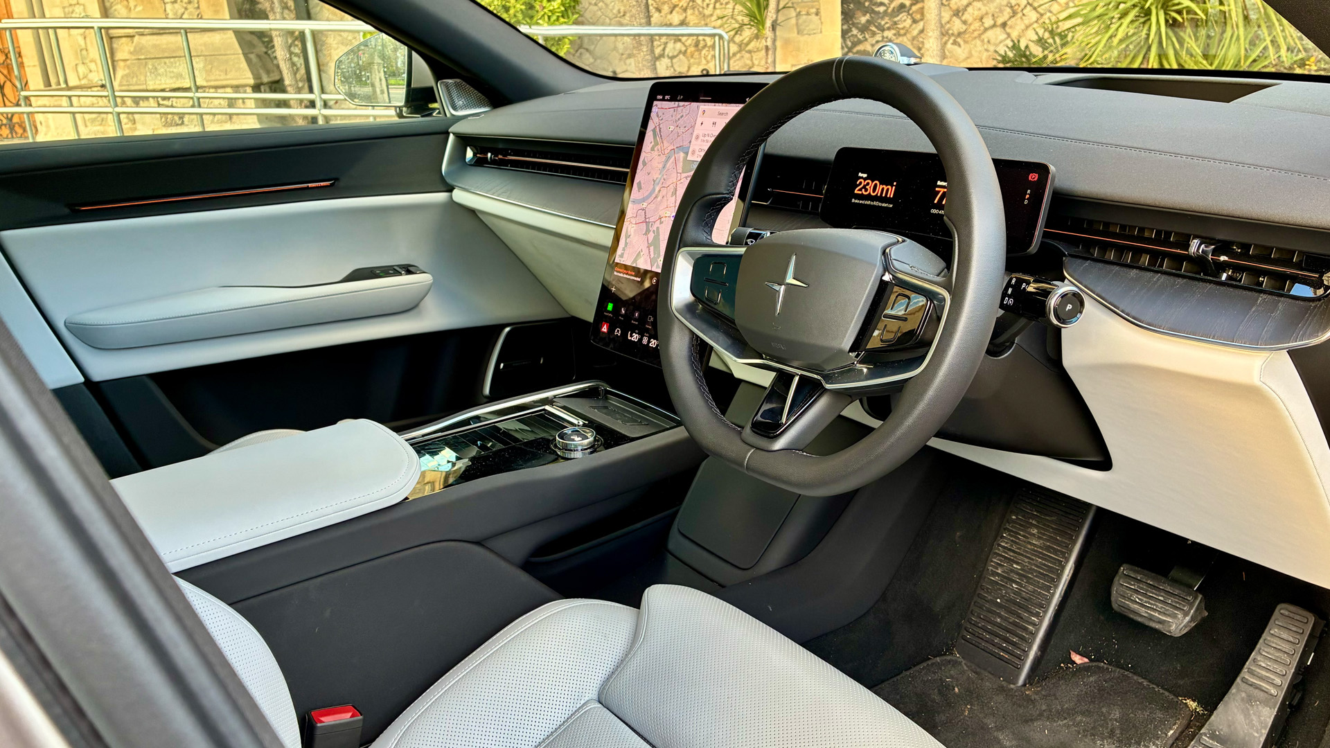 The car looks great in its silver-gold paint called ‘Jupiter’ and I love a light-coloured interior, so it had to be the white leather, which Polestar calls ‘zinc’ – although I might regret it with my three kids.