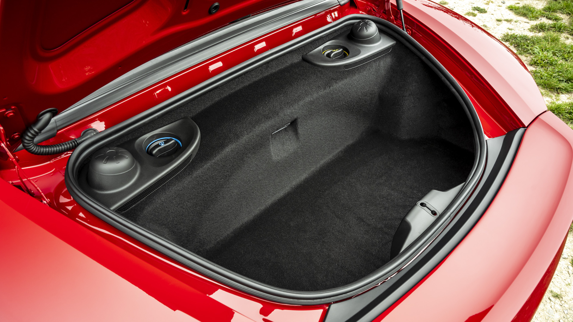 ‘Practical’ wouldn’t be a word you would use to describe the interior, but for a two-seater sports car it’s not terrible. The two seats you do get are spacious and the range of adjustability offered by both the steering wheel and driver’s seat make getting comfortable behind the wheel simple. You also get 275 litres of luggage capacity (about what you’d get in a Ford Fiesta) split almost equally between front and rear boots.