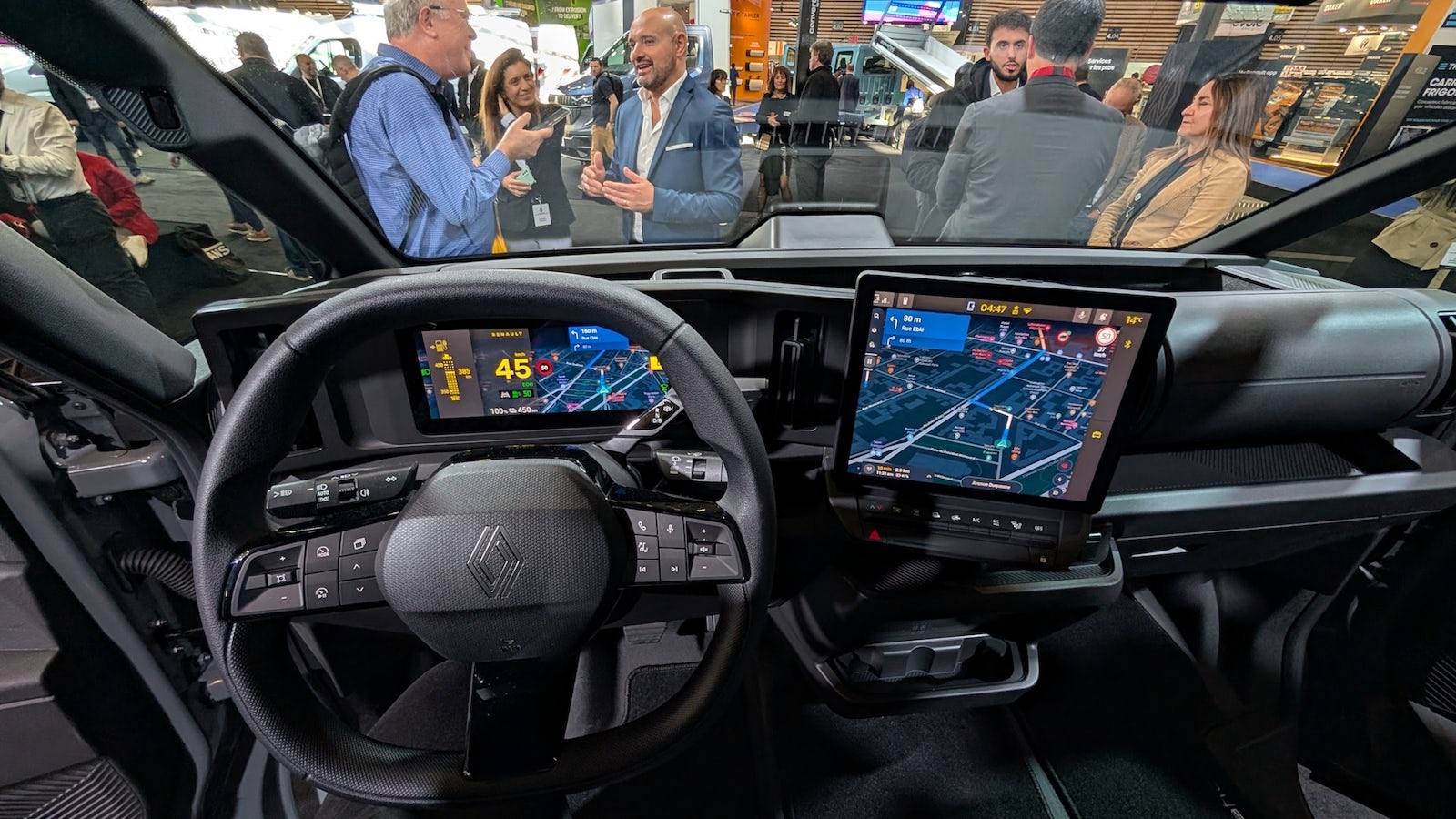 There’s a wraparound windscreen and a high-set black panel that runs the full width of the front end, incorporating an LED light bar with illuminated Renault logo. The main headlight units are set lower in the dash.