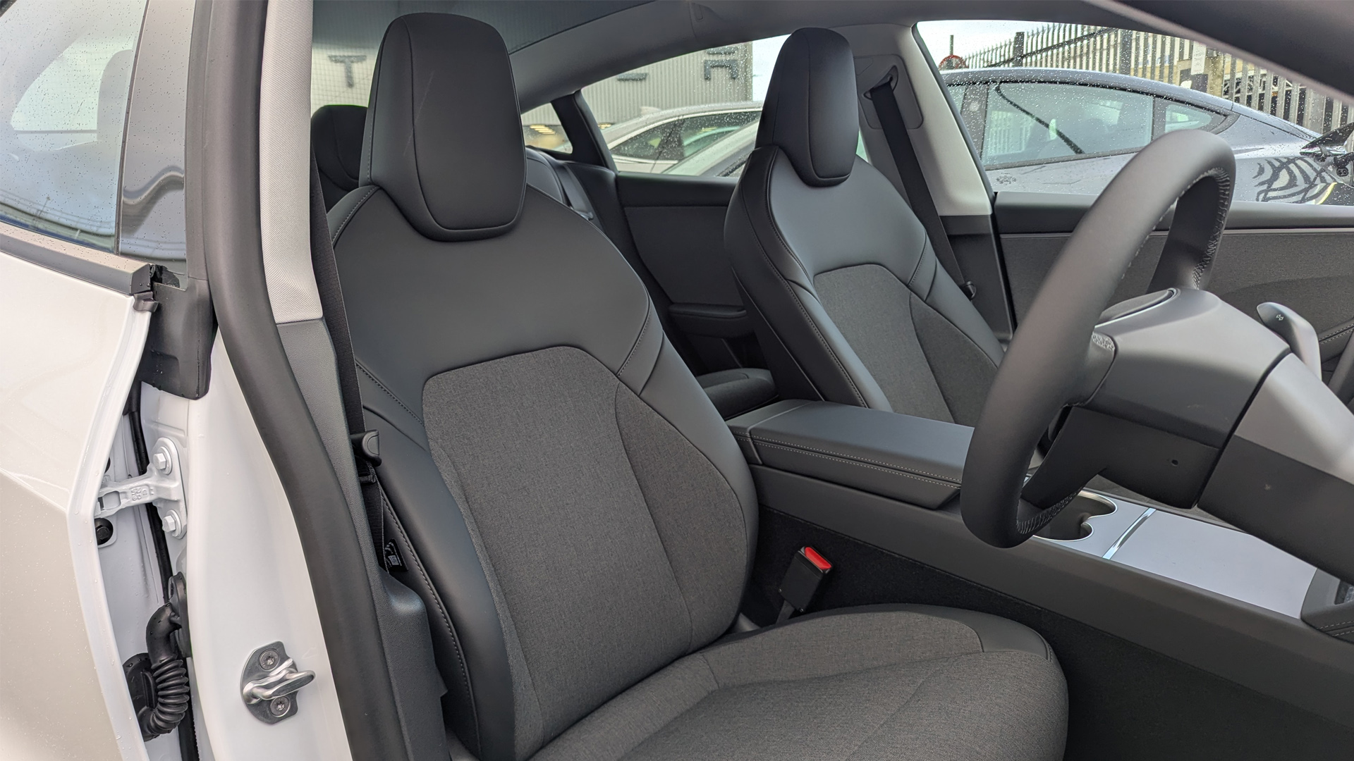 Inside there are a few more noticeable differences, the most obvious being the half-cloth seats. You also get simpler ambient lighting with fewer colour options, a manually-adjustable steering column as opposed to an electric one and the seat controls have been moved to the screen instead of having buttons on the seat itself.