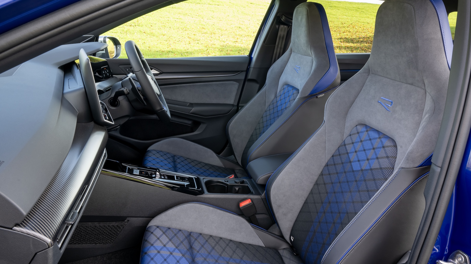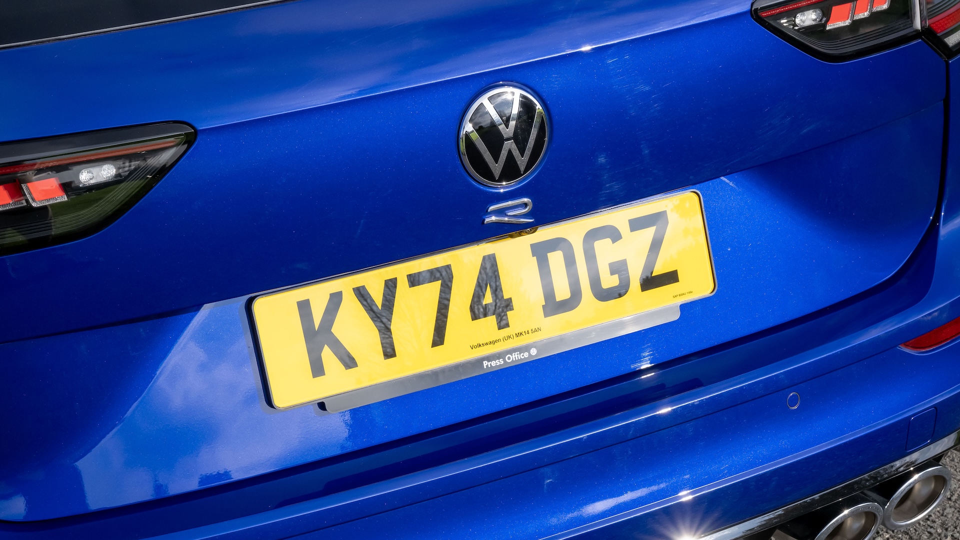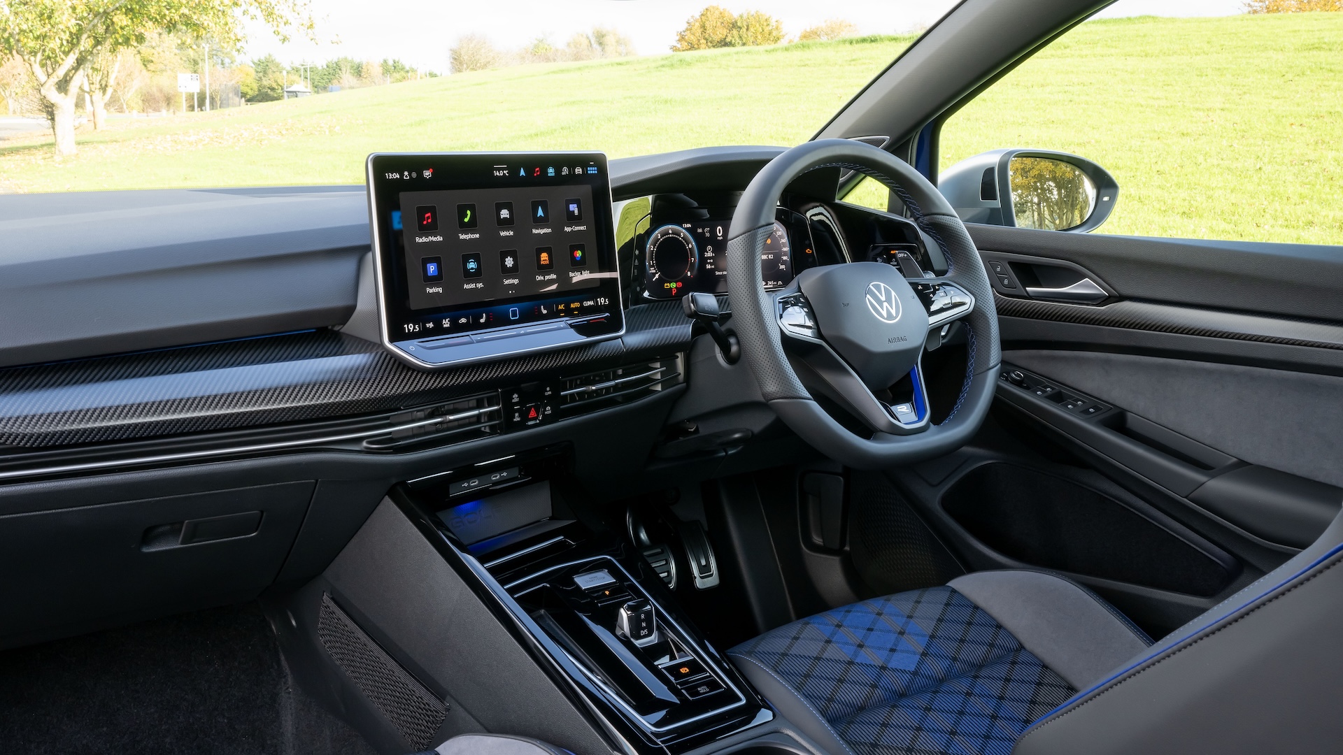 Inside, there are blue tartan inserts for the bucket seats, and there has been a significant uplift in overall quality for this Mk8.5 model. The new 12.9-inch touchscreen is a big improvement over the previous infotainment system, and it’s much better and more responsive to use, even if it’s still too fiddly and annoying at times. It also sometimes struggles to connect to your phone, and please can we have a return of proper physical buttons? While the regular Golf and the GTI have been given a new steering wheel with proper buttons on it, the R sticks with the previous model’s touch-sensitive pads, which are really fiddly and awkward to use.