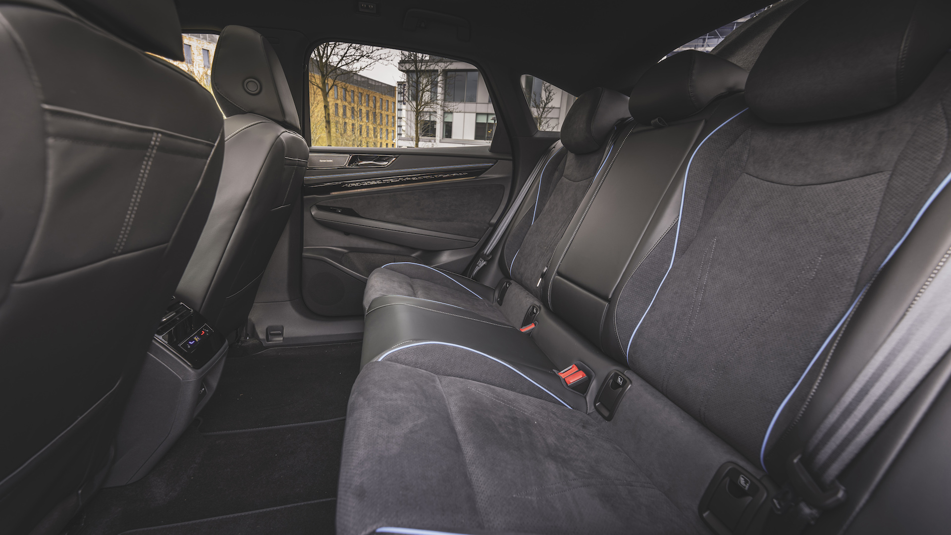 Storage up front isn’t bad. The door bins are large, and felt-lined so that items you place in them won’t rattle. There’s also a large cubby under the central armrest, while the two hideaway covers in the centre console conceal a pair of cupholders, two USB-C ports and a wireless charging pad. The glovebox is quite small, though.