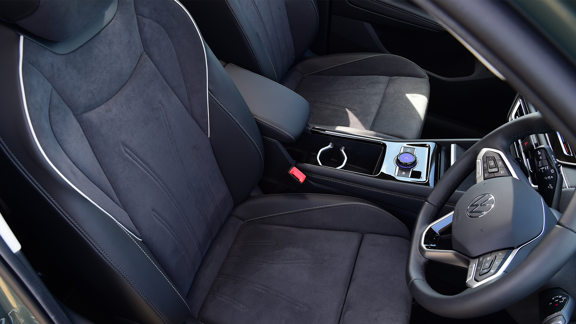 The interior is similarly stylish-yet-restrained, especially in upper-rung models such as the R-Line, which gets Alcantara trim across the dashboard and door cards. A huge 12.9-inch standard-fit infotainment screen dominates the dashboard, while soft-touch plastics and a smart design at least go some way to justifying the Tiguan’s price.