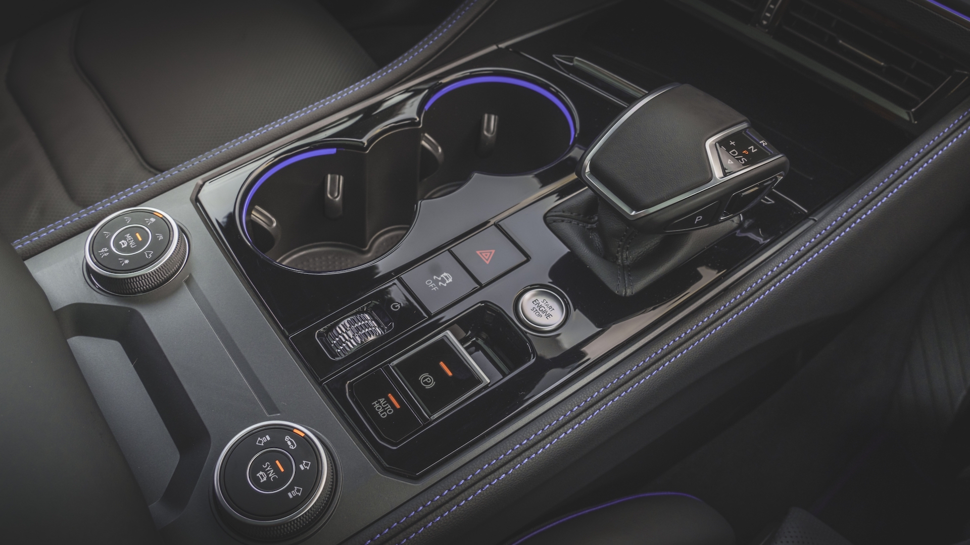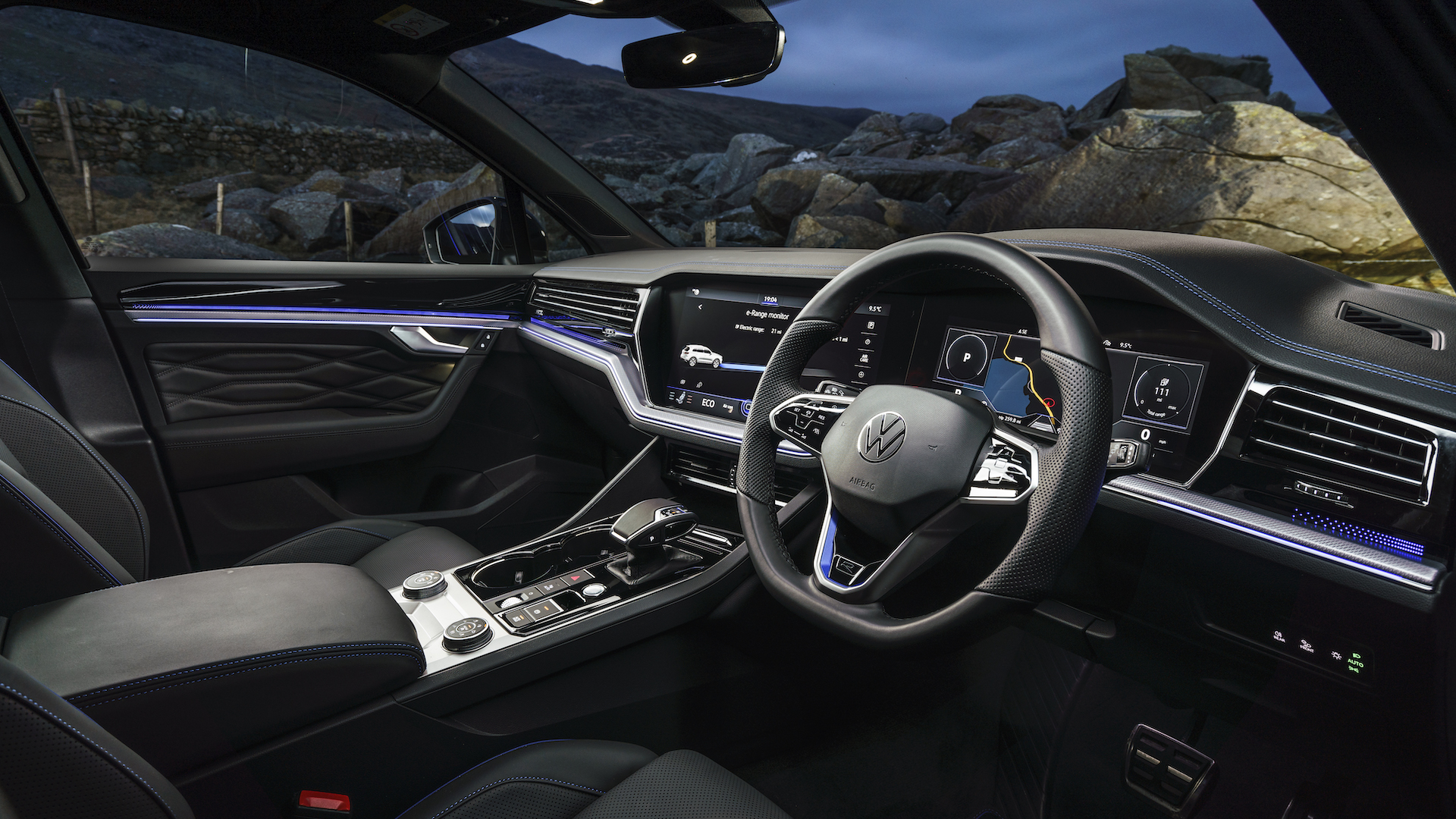 The cabin is quite dark, but bright blue stitching and detailing does lift it somewhat. So too does the ambient lighting, which is extensive and multi-configurable - endless fun to play with. Quality, meanwhile, is tip-top - everything you touch is swathed in solid-feeling materials, though a BMW X5 does feel notably more luxurious if not necessarily better-built. To match the Touareg, you’d need to specify the extended leather package on a Porsche Cayenne e-Hybrid.