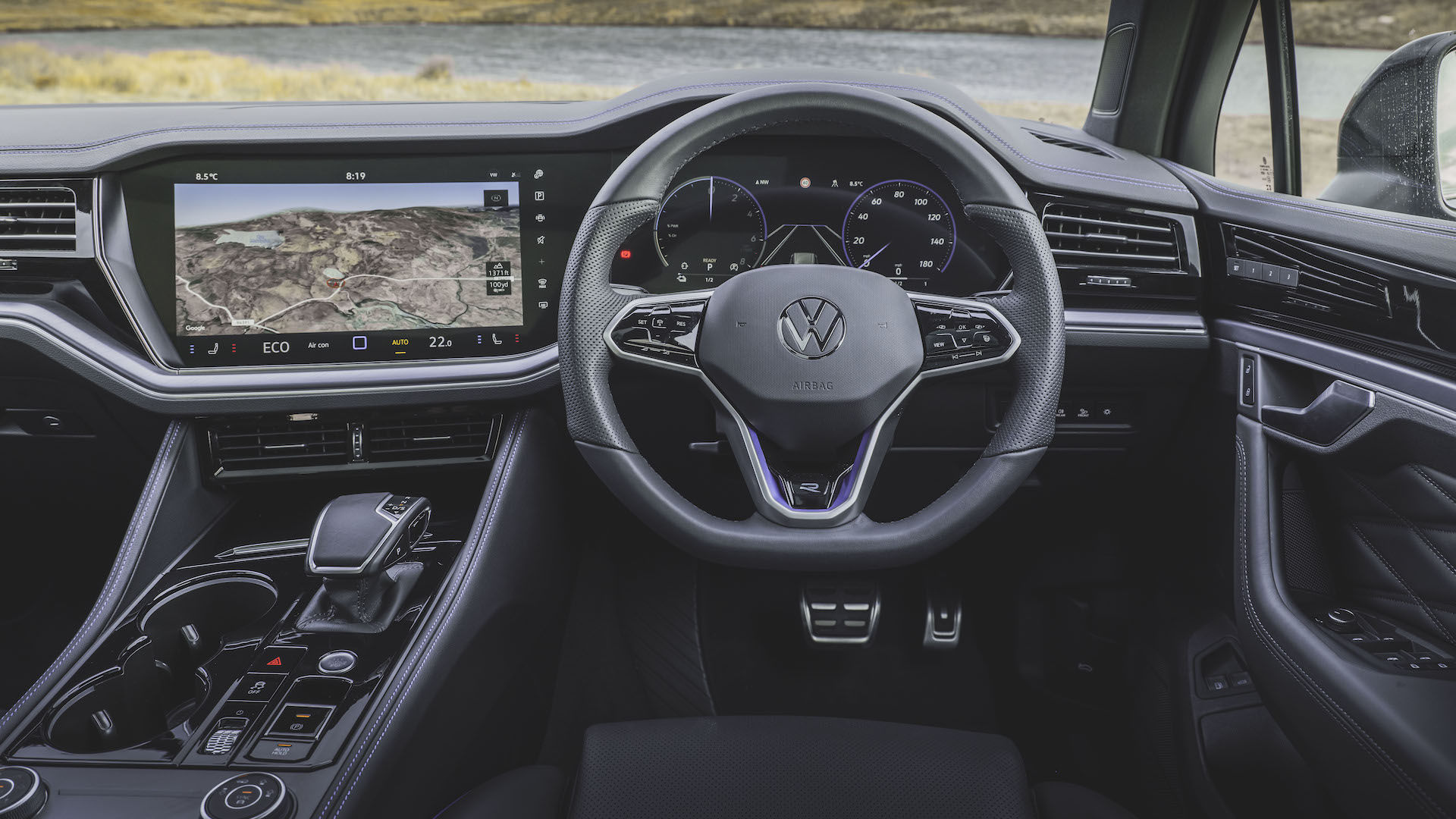 Inside, you wouldn’t know the Touareg was intended to be a sporty product. Though the ‘R’ badge is sprinkled liberally across the software and on the steering wheel, the Touareg R’s seats are large, comfortable and supportive, and the colour palette is a muted blue rather than the aggressive red of some more overtly macho offerings.