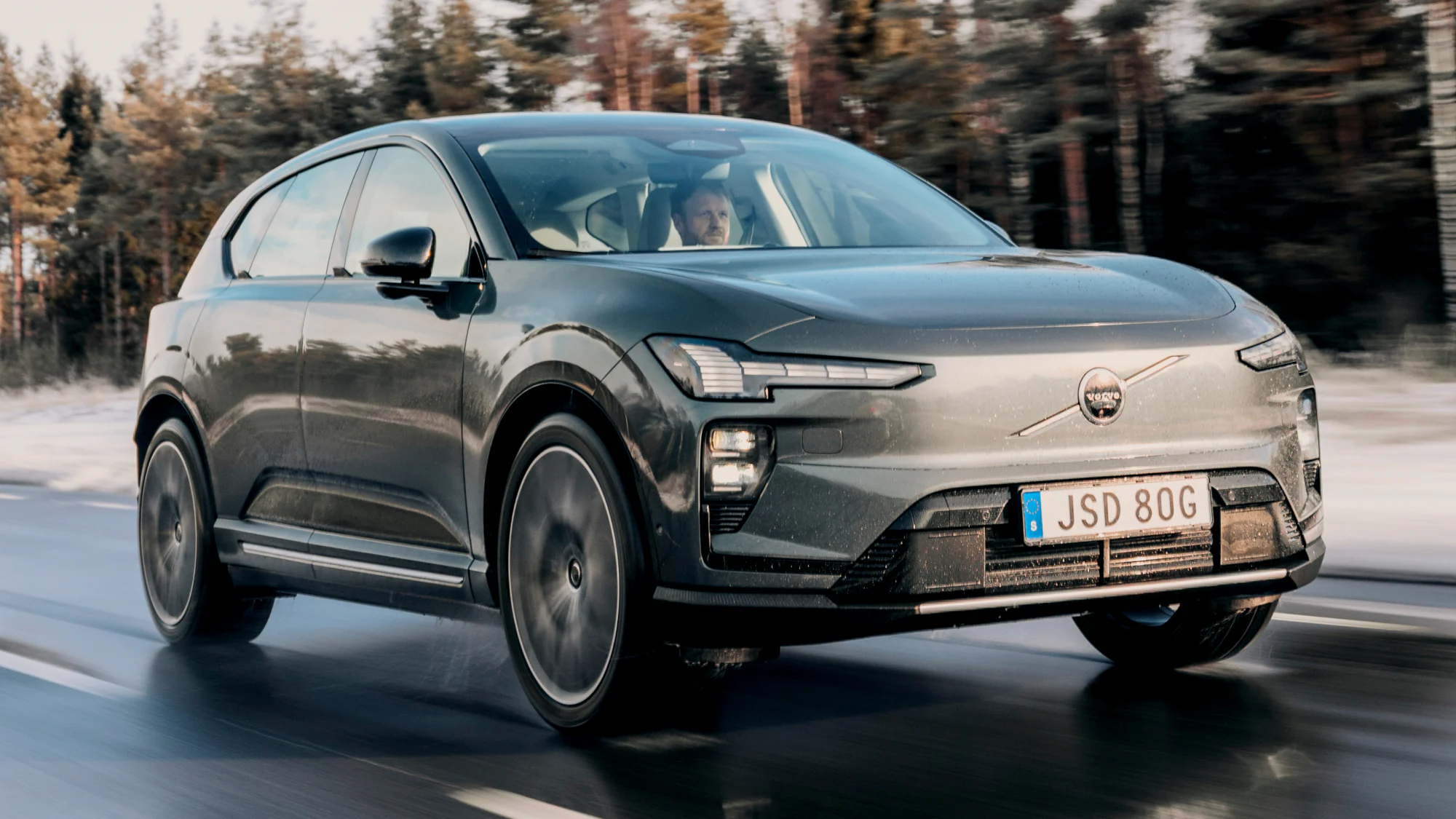 Volvo also subjects the EX60 to some seriously smashy — and deeply impressive — crash tests, way above anything that’s done on the Euro NCAP tests, including firing a test car out the side of the company’s massive safety testing lab, down a muddy, leaf-strewn slope, and straight into a metal pole, simulating a high-speed run-off road crash into a tree.